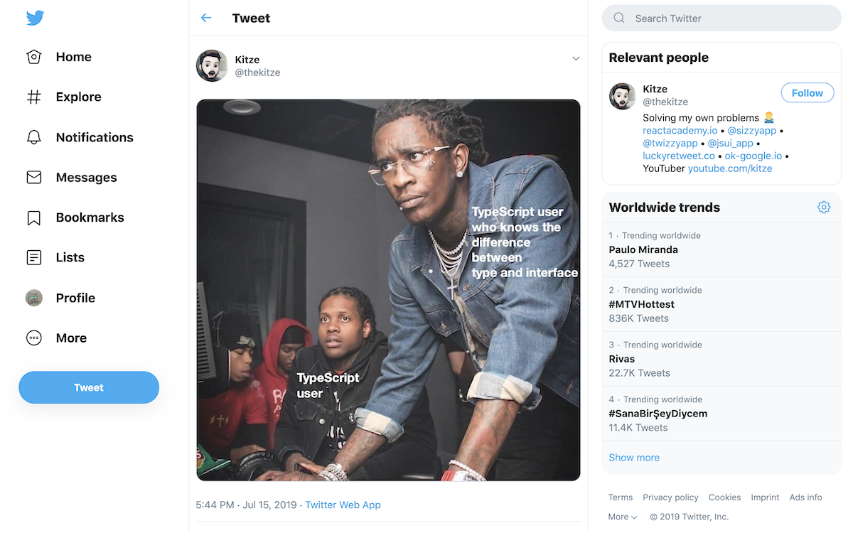 In one of my recent PRs I changed all interfaces to types because there were already more types than interfaces. In the review, I was asked to revert the change. I did it, but as well I wondered what the actual difference between interface and type. Let’s figure out this. I use the latest TS (v3.5.1) for examples in this post.